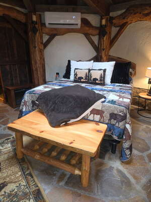 The Hobbit House at Fernstone is truly a one of a kind structure, not only in the Laurel Highlands, but beyond! All woodwork was handcrafted by a very talented local carpenter who builds unique structures for Ohiopyle Vacation Rental properties throughout the area. The ceiling of The Hobbit House is truly a masterpiece, with interwoven beams, designed to be self-supporting that converge in the center of the room to create a skylight, allowing guests to enjoy natural views and star-lit nights. The sink, countertops, headboard and footboard were also hand-hewn from locally sourced black walnut, repurposed from The Fernstone Retreat property in which the Hobbit House resides. The posts of the bed are incredibly unique, built from pine trees cut at root height, giving the illusion that they're rising from the floor. On the outside, you’ll appreciate the thoughtful placement among the trees, ferns, and ponds that make Fernstone so special; but when you step foot inside, that is when the magic really begins. In fact, when you aren’t exploring the grounds and taking in the natural beauty of the Laurel Highlands, you’ll be spending your time trying to figure out the craftsmanship that went into weaving the heavy oak timbers together to form the reciprocal rafter roof structure. And this is a type of construction that is rare indeed! Conveniently inherent in the design, is the opportunity for the stunning clear glass dome over the bed that allows you to gaze at the stars as you drift off to sleep. And of course, no OVR stay is complete without a well appointed bathroom, complete with tiled shower and unique custom made sink. So if you’re looking for a one of a kind stay in a one of a kind setting, The Hobbit House at Fernstone is an easy choice!